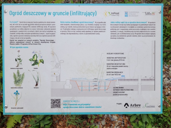 61, 105 / 2020 Jeden z trzech ogrodów deszczowych stworzonych w ramach realizacji dwóch projektów zgłoszonych w kategorii ogrody deszczowe: "Dobrze nawodnione miasto - ogrody deszczowe" i "Lubelskie ogrody deszczowe". Pozostałe lokalizacje: park Jana Pawła II i Obrońców Pokoju.